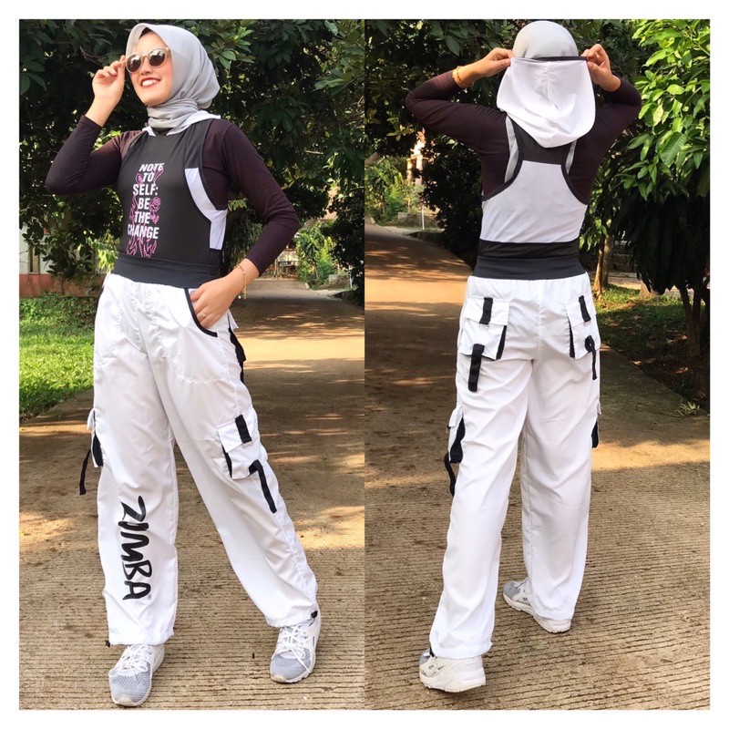 Celana Senam Olahraga Zumba Putih Lis Hitam Cargo / Celana Training Fitness Cycling Running Gym