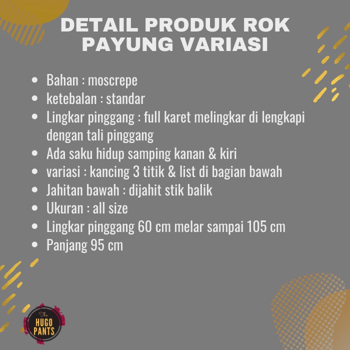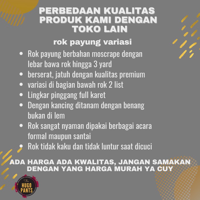 - Produk ini tidak sedang Flash Sale, tidak semua Seller suka Flash Sale, saya rasa ini bukan kekurangan, Jika Anda anggap Harga Rp. 49.680,00 itu murah untuk ROK PAYUNG PANJANG JUMBO BAWAHAN WANITA MUSLIM BAHAN MOSCRAPE VARIASI KANCING KOMBINASI ya ambil saja